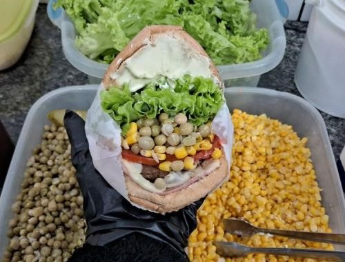 PÃO,PEITO DE FRANGO,PRESUNTO,QUEIJO,TOMATE,ALFACE,MILHO,ERVILHA,MAIONESE,CATCHUP E MOSTARDA.